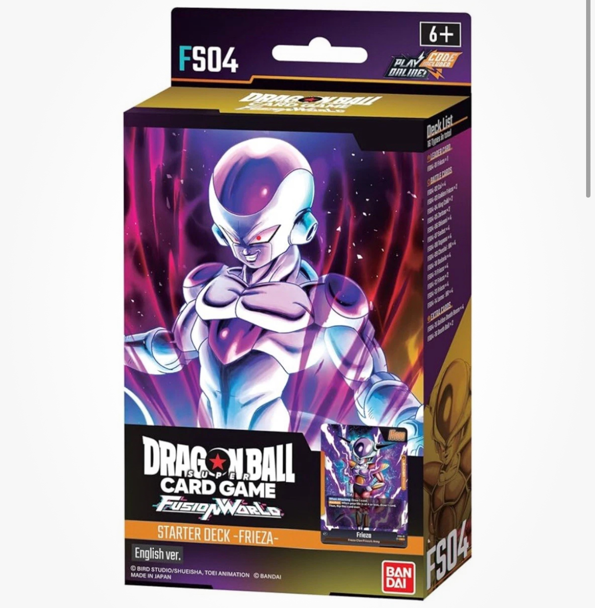 The product is a Dragon Ball Fusion World: Frieza (FS04) starter deck featuring 51 cards from the Dragon Ball Super Card Game. Manufactured by Bandai in Japan, this deck is part of the Fusion World set and has a Dragon archetype. The standard-sized cards are made of paper and are ideal for collectors and players of the game. This particular deck is designed for the Nor Con convention/event and is a perfect addition to any Dragon Ball card collection.