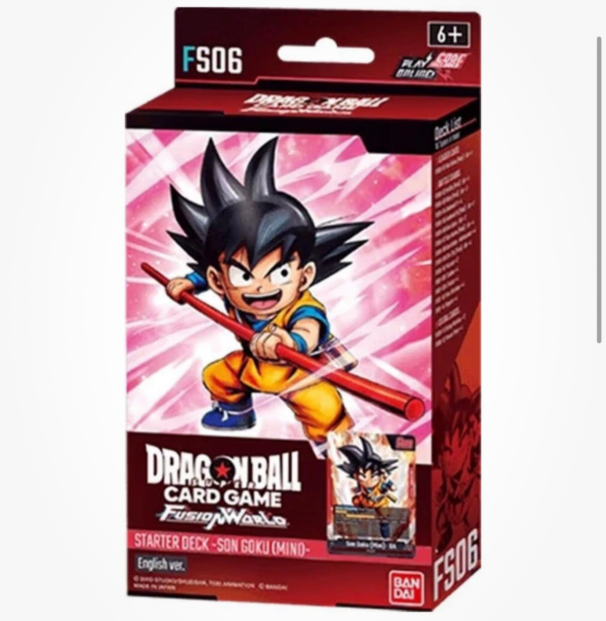 The Dragon Ball Fusion World Goku Mini (FS06) card is a standard-sized collectible card from the Fusion World set manufactured by Bandai. This deck features the popular character Goku and belongs to the Dragon archetype within the Dragon Ball Super Card Game. Produced in 2024, this English-language starter deck is made with paper material and is perfect for players looking to enhance their collection with a piece of the iconic Dragon Ball universe.