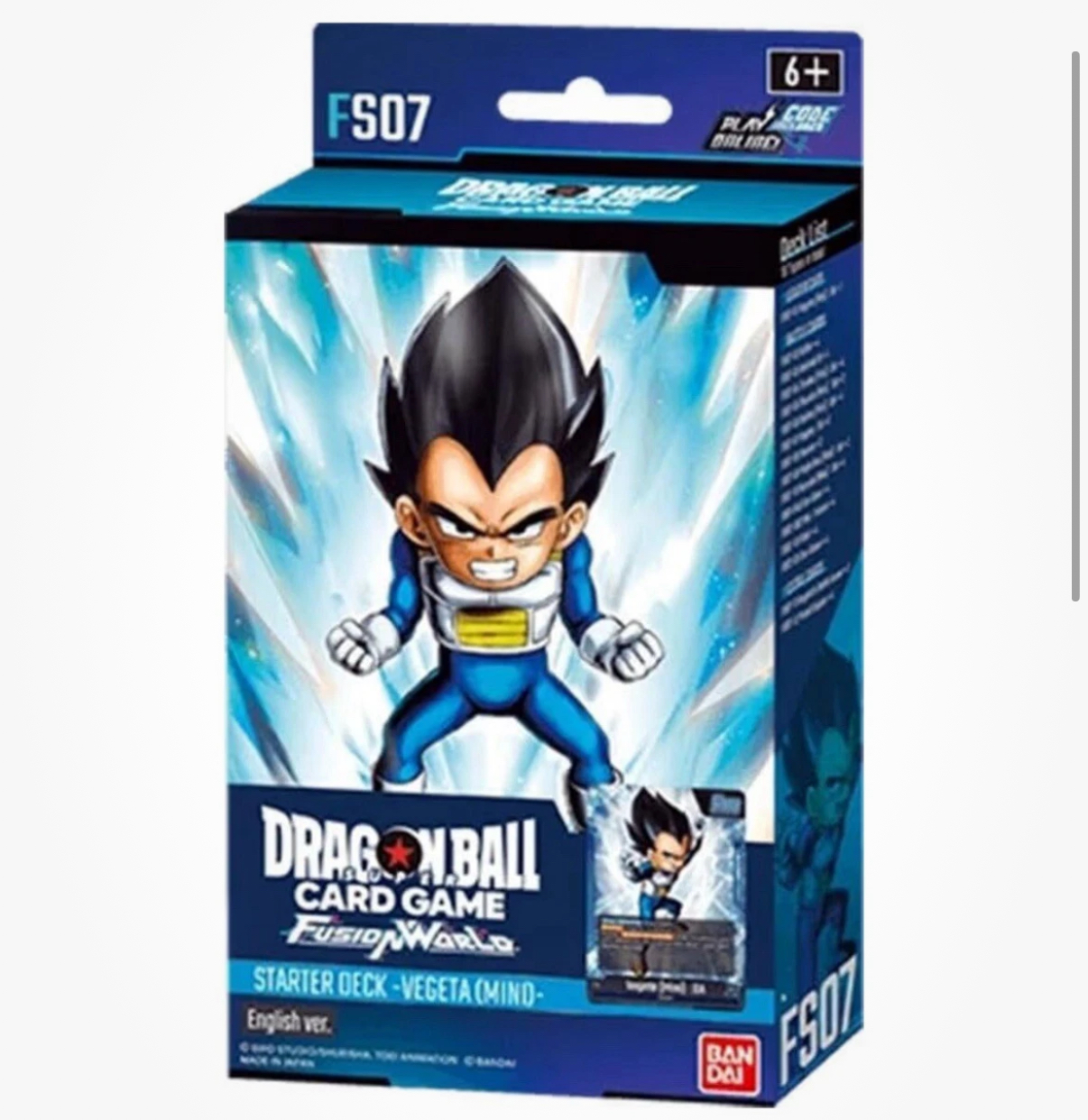 The Dragon Ball Fusion World: Vegeta Mini (FS07) is a standard-sized collectible card game set featuring 51 cards in a deck configuration. Manufactured by Bandai in Japan, this English-language starter deck is designed for ages 6 and up. With a Dragon archetype, this set is part of the Dragon Ball Super Card Game collection from 2024. Perfect for fans of the series, this mini deck offers an immersive gaming experience with a focus on the character Vegeta.