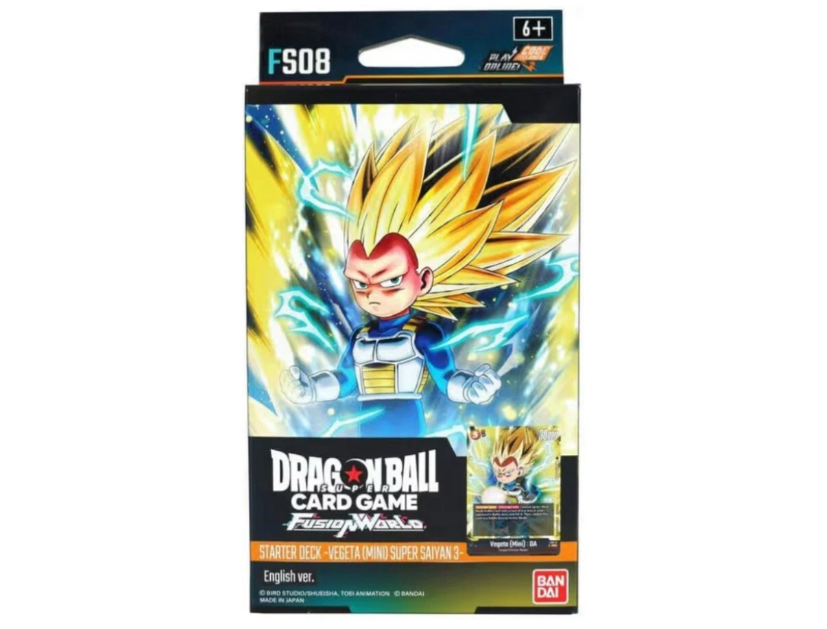 The Dragon Ball Super: Fusion World Vegeta Mini SSJ3 (FS08) is a collectible card game starter deck manufactured by Bandai in Japan. This deck features cards from the Dragon archetype, specifically focused on Vegeta in his Super Saiyan 3 form. With a standard card size and made of paper, this deck is perfect for fans of the Dragon Ball Super Card Game looking to enhance their gameplay with powerful cards from the Fusion World set.